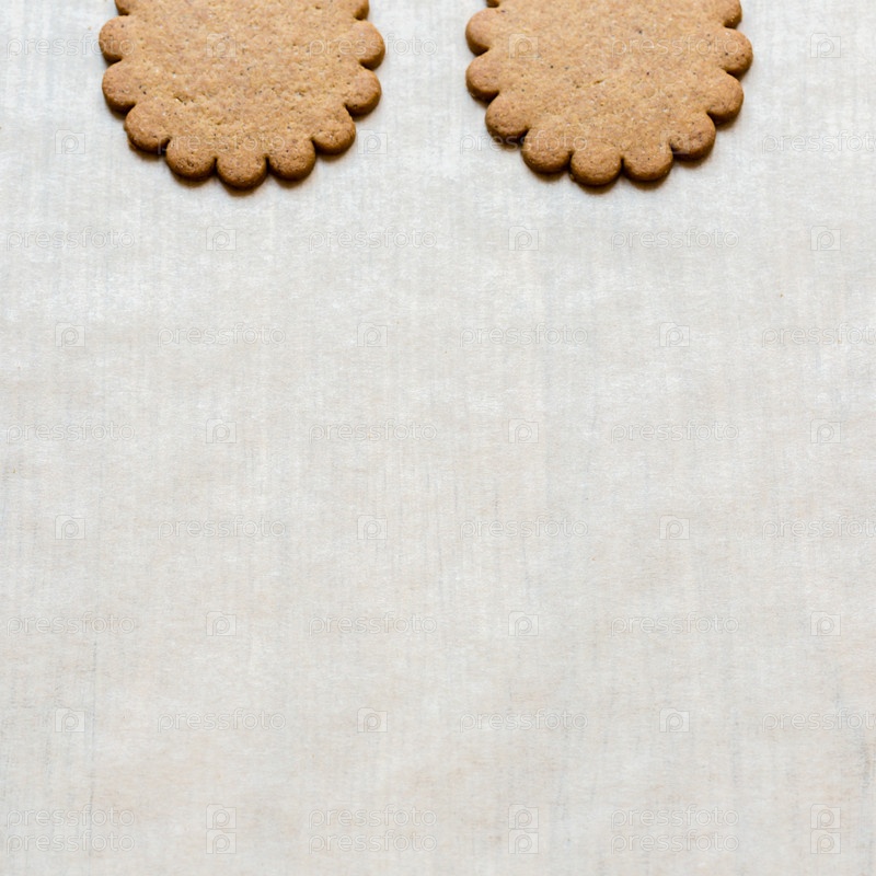 Фон с двумя имбирными печеньями на бумаге для выпечки, традиционное рождественское угощение. Текстовое пространство, пустой шаблон