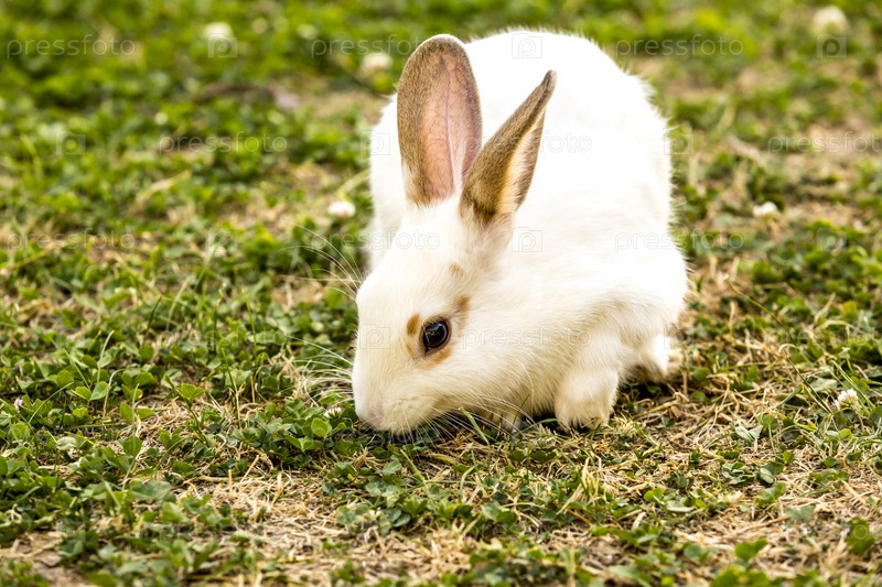 Маленький белый кролик (Oryctolagus cuniculus) сидит на зеленой траве