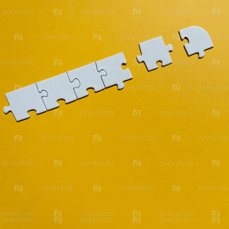 Белые кусочки головоломки на желтом фоне. Концепция настольной игры