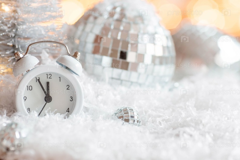 Красивый фон с часами, блестками, шарами и украшениями. Обратный отсчет до полуночи. Часы последних мгновений перед Новым 2023 годом. Празднование зимних рождественских праздников