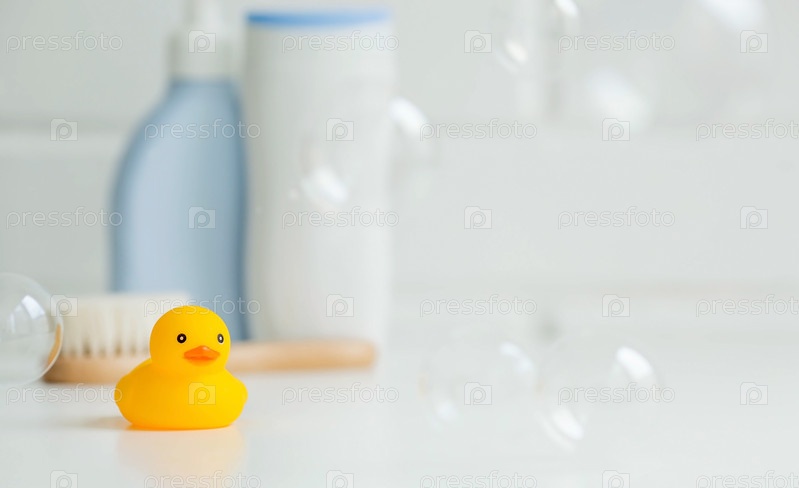 Детские банные принадлежности. Уход за детьми. Миниатюрный желтый резиновый утенок для купания с щеткой и бутылками с шампунем. Мыльные пузыри, пена для ванн