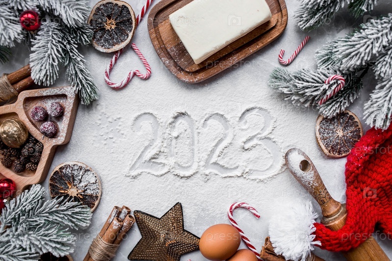 С Новым 2023 годом. Баннер с кухонной утварью, рождественскими украшениями, корицей, пряниками и елью на мраморном фоне. Поздравительная открытка на Рождество. Концепция кафе и ресторанов