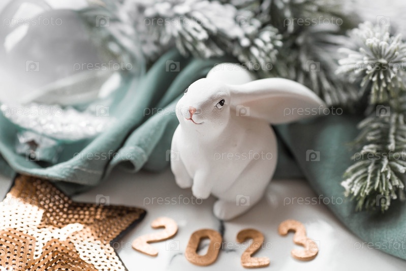 Красивая праздничная открытка. Концепция счастливого нового года и Рождества. Символ года — белый кролик на фоне еловых веток и цифры 2023