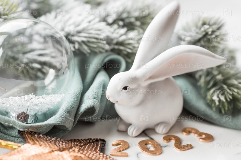 Красивая праздничная открытка. Концепция счастливого нового года и Рождества. Символ года — белый кролик на фоне еловых веток и цифры 2023