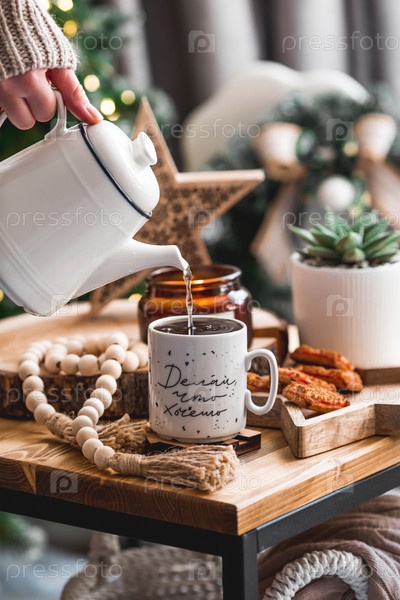 Образ жизни. Чашка чая на деревянном столе во время рождественских праздников. Надпись на кружке на русском: делай что хочешь. Натюрморт. Понятие домашнего тепла, уюта