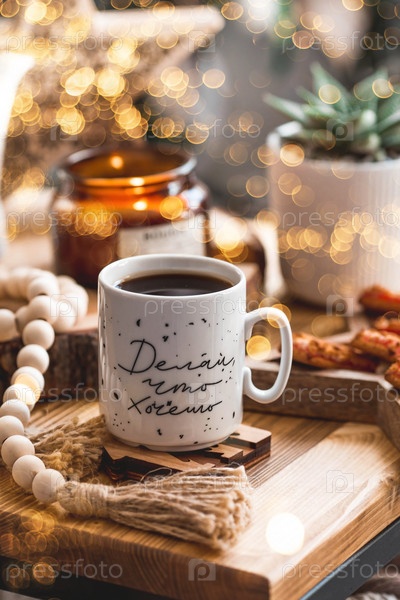 Образ жизни. Чашка чая на деревянном столе во время рождественских праздников. Надпись на кружке на русском: делай что хочешь. Натюрморт. Понятие домашнего тепла, уюта