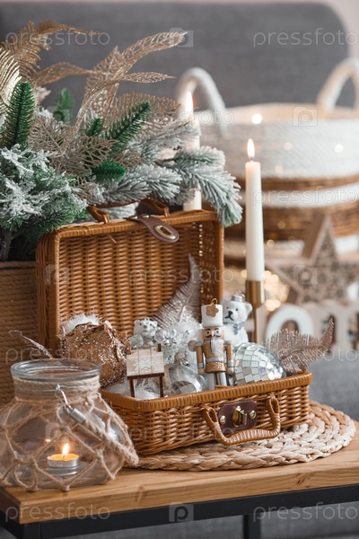 Уютная зимняя концепция. Домашнее тепло в холодную, морозную погоду. Натюрморт. Рождественские игрушки, плетеная корзина, свечи и еловые ветки на журнальном столике в интерьере дома гостиной