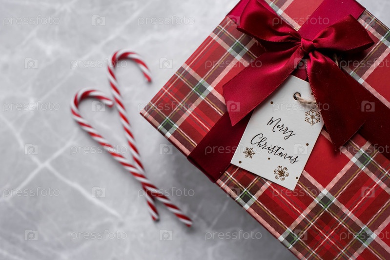Красная подарочная коробка в клетке и этикетка с надписью "Счастливого Рождества" на фоне серого мрамора. Рождественские праздники 2023. Покупка и подготовка подарков для родных и близких