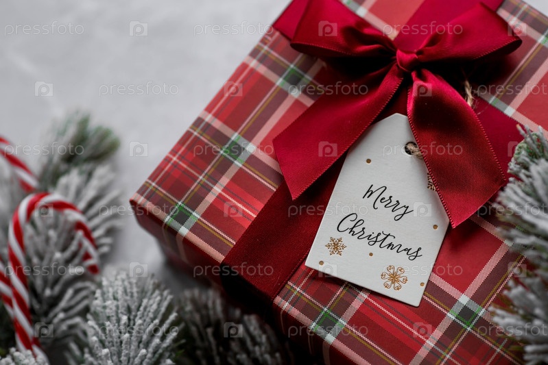 Красная подарочная коробка, еловые ветки, леденец и этикетка с надписью "Счастливого Рождества" на фоне серого мрамора. Рождественские праздники 2023. Покупка и подготовка подарков для родных и близких