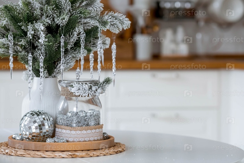 Еловый букет с сосульками на белом кухонном столе. Новогодние украшения в интерьере. Концепция подготовки к новогоднему празднику