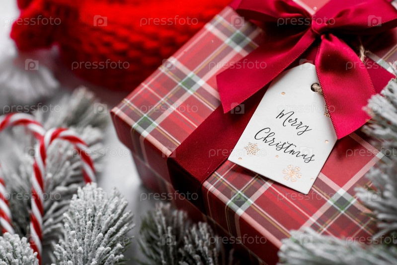 Красная подарочная коробка, еловые ветки, леденец и этикетка с надписью "Счастливого Рождества" на фоне серого мрамора. Рождественские праздники 2023. Покупка и подготовка подарков для родных и близких