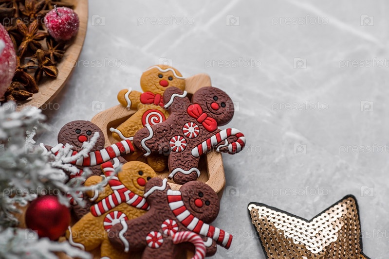С Новым 2023 годом. Баннер с рождественскими украшениями, корицей, выпечкой и пряничными человечками на мраморном фоне. Поздравительная открытка на Рождество. Концепция кафе и ресторанов