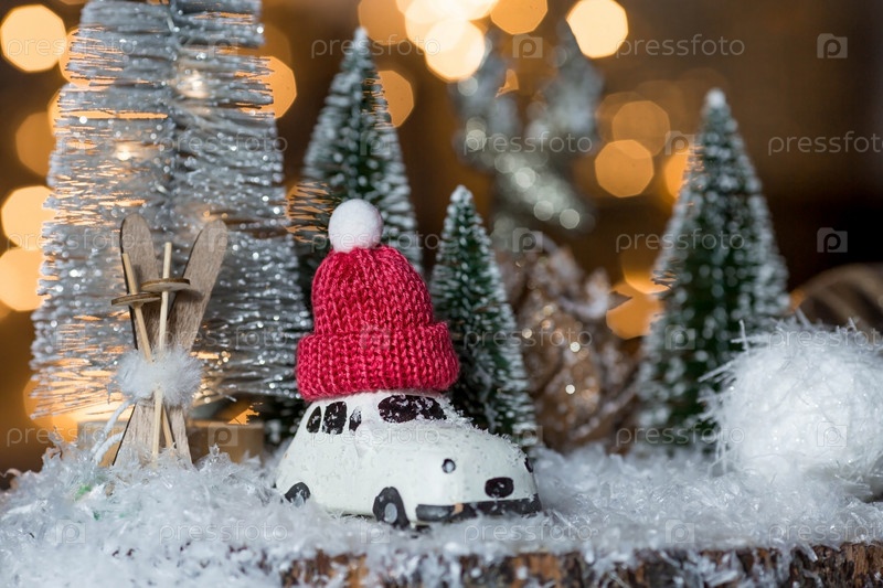 С Новым 2022 годом. Красивый фон с автомобилем с красной шапкой на крыше, елками и украшениями. Празднование зимних рождественских каникул. Концепция начала года