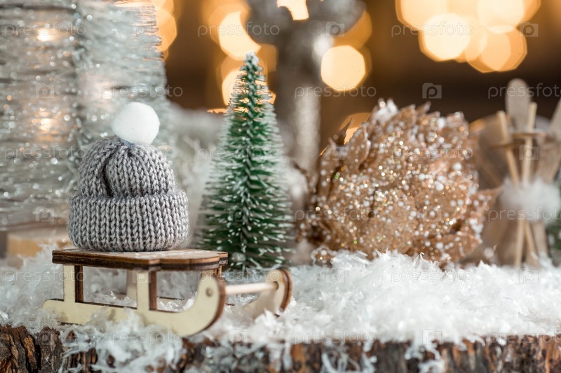 С Новым 2022 годом. Красивый фон со свечами, санками с вязаной шапкой, елками и украшениями. Празднование зимних рождественских каникул. Концепция начала года
