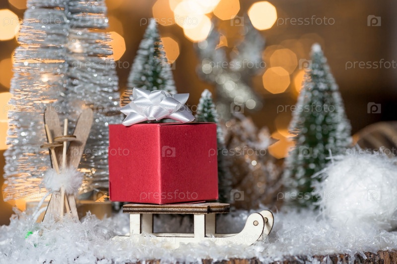 С Новым 2022 годом. Красивый фон с деревянными санками, подарком, елками, снегом и украшениями. Празднование зимних рождественских каникул. Концепция начала года