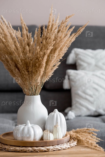 Натюрморт. Сухая пампасная трава в вазе, белые керамические тыквы, чайник, чашка и свечи в форме тыквы на журнальном столике в домашнем интерьере гостиной. Уютная осенняя концепция