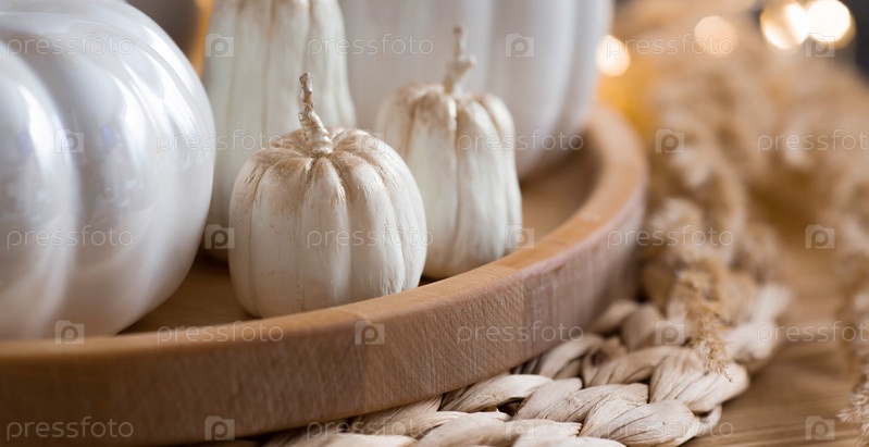 Натюрморт. Белые керамические тыквы, пампасная трава, свечи в форме тыквы на журнальном столике в домашнем интерьере гостиной. Детали декора. Уютная осенняя концепция