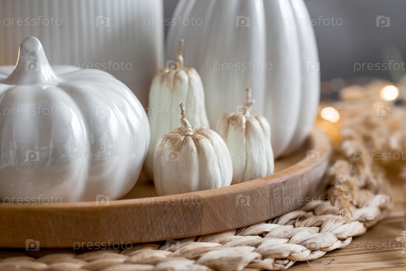 Натюрморт. Белые керамические тыквы, пампасная трава, свечи в форме тыквы на журнальном столике в домашнем интерьере гостиной. Детали декора. Уютная осенняя концепция