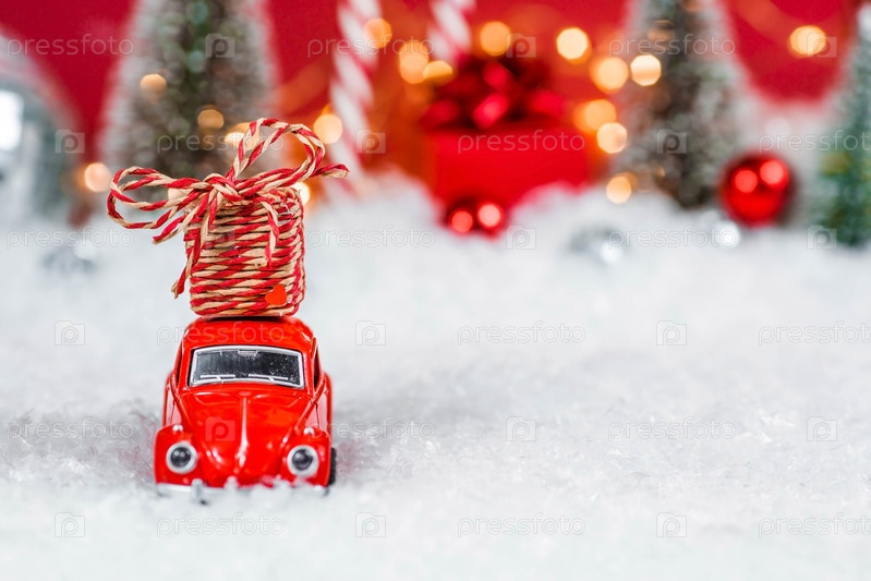 Рождественский красный ретро-автомобиль с подарочной коробкой в красном снежном пейзаже на фоне боке. Место для текста. Концепция доставки товаров и поздравительная открытка с Новым годом