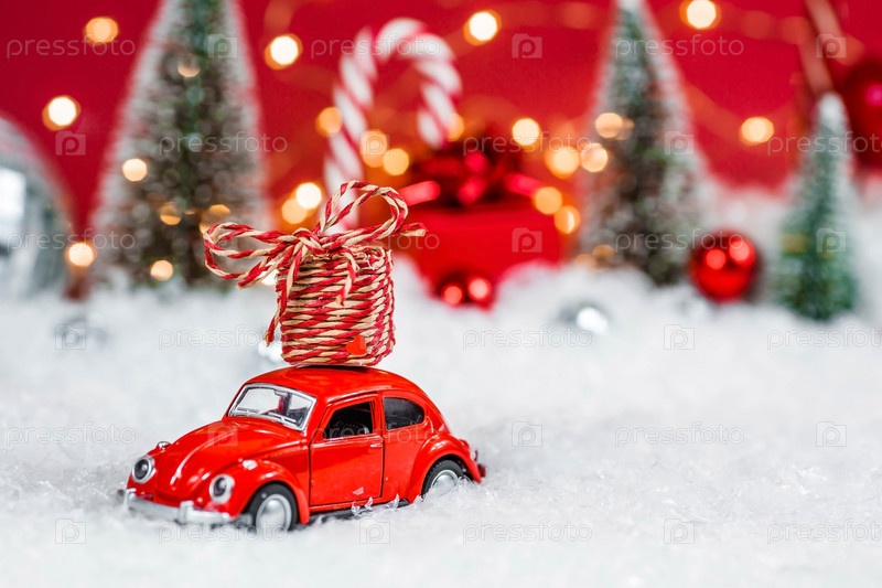 Рождественский красный ретро-автомобиль с подарочной коробкой в красном снежном пейзаже на фоне боке. Место для текста. Концепция доставки товаров и поздравительная открытка с Новым годом
