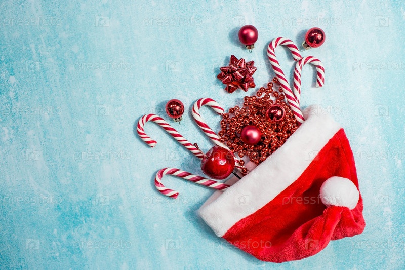 Рождественская шапка Санта-Клауса с рождественскими конфетами, игрушками и блестками на синем фоне. Минимальная рождественская концепция. Карамельная трость. Копия текстового пространства