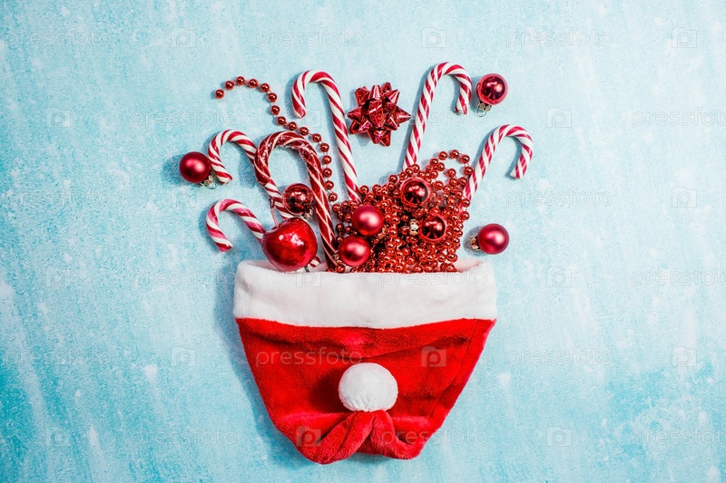 Рождественская шапка Санта-Клауса с рождественскими конфетами, игрушками и блестками на синем фоне. Минимальная рождественская концепция. Карамельная трость. Копия текстового пространства