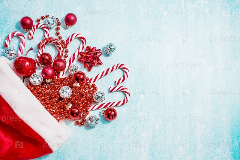 Рождественская шапка Санта-Клауса с рождественскими конфетами, игрушками и блестками на синем фоне. Минимальная рождественская концепция. Карамельная трость. Копия текстового пространства