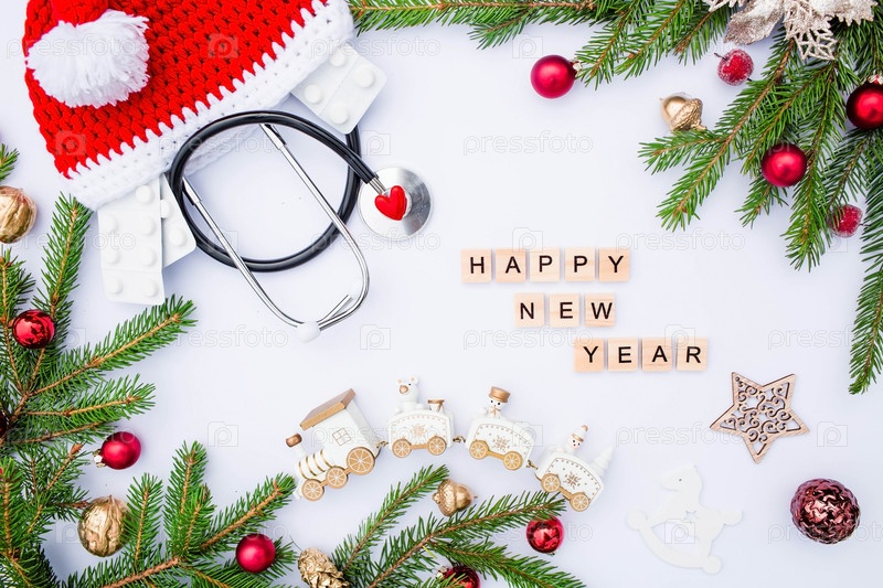Медицинский баннер 2023 года для клиник с таблетками, стетоскопом и рождественской елкой на белом фоне. Копипространство. Медицина новый год плоский