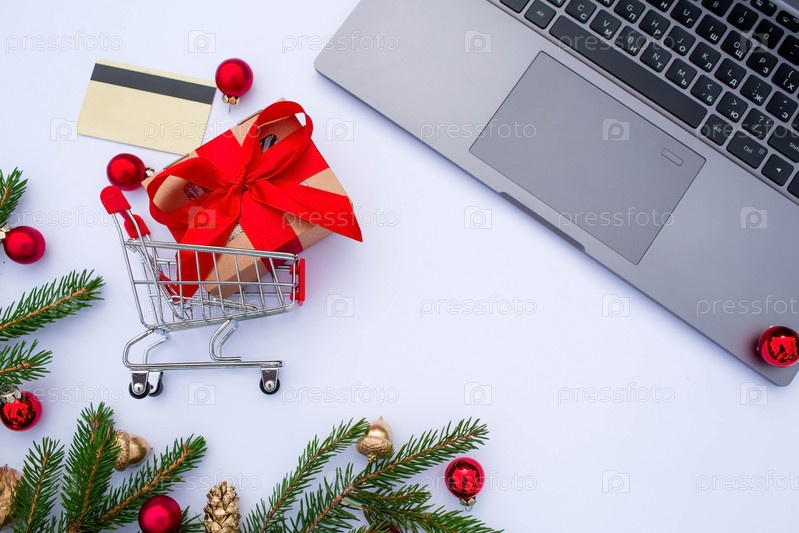 Баннер. Компьютер, подарочная корзина и кредитная карта. Рождественские интернет-магазины. Зимние праздничные распродажи, сезонные распродажи, Черная пятница, Рождество, скидки и покупки на месте