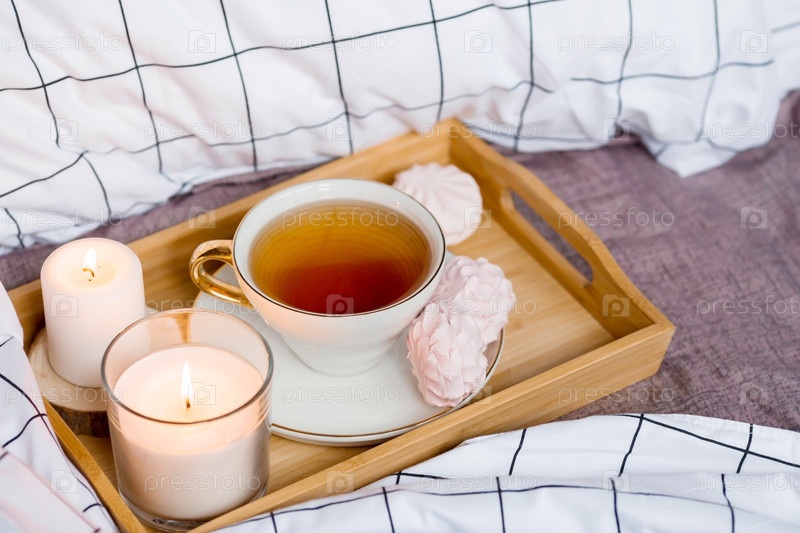 Деревянный поднос с чаем, зефиром и свечами на кровати. Белые простыни с полосатым одеялом и подушкой. Завтрак в постель