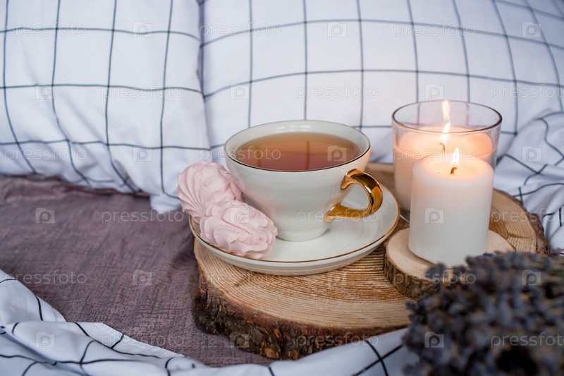Деревянный поднос с чаем, зефиром, свечами и лавандой на кровати. Белые простыни с полосатым одеялом и подушкой. Завтрак в постель
