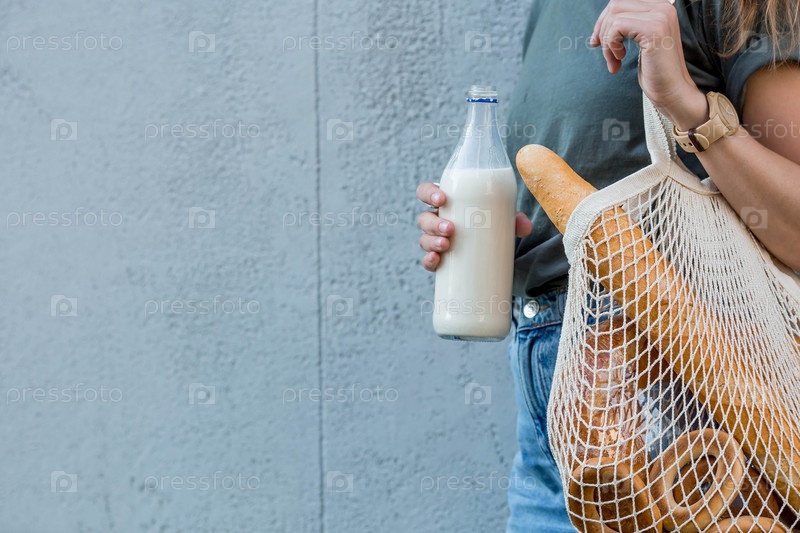 Современная стильная женщина со стеклянной бутылкой молока и авоськой покупает хлеб у серой стены. Концепция здорового питания и экологии. Отказ от пластиковых пакетов