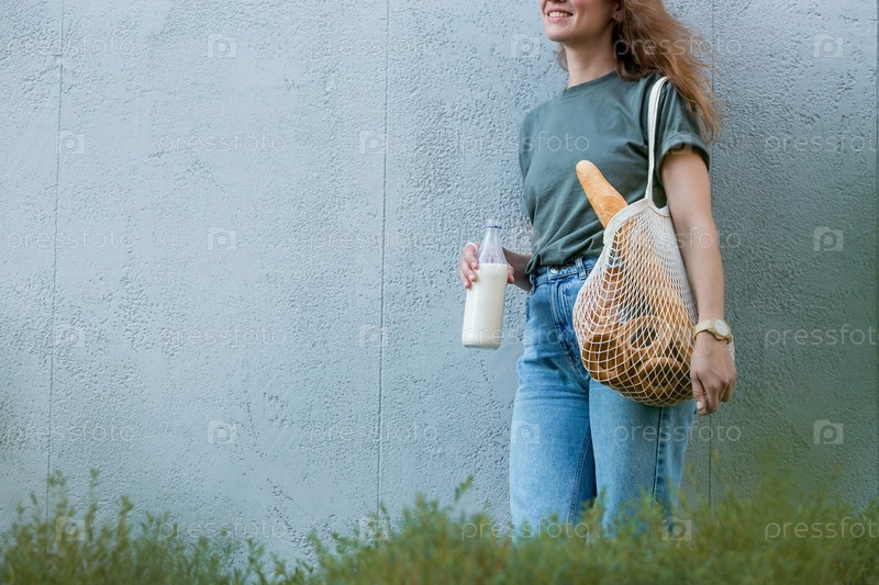 Современная стильная женщина со стеклянной бутылкой молока и авоськой покупает хлеб у серой стены. Концепция здорового питания и экологии. Отказ от пластиковых пакетов