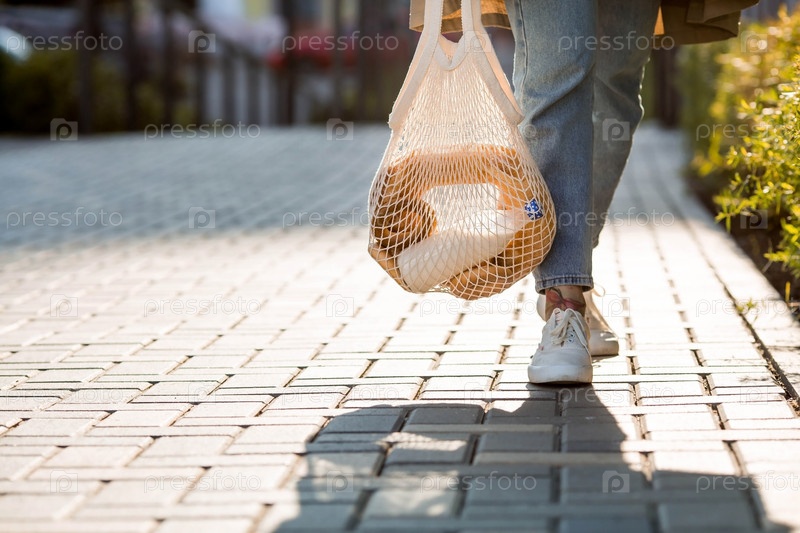Современная стильная женщина со стеклянной бутылкой молока и авоськой покупает хлеб у серой стены. Концепция здорового питания и экологии. Отказ от пластиковых пакетов