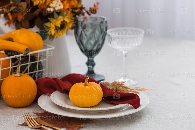 Красивая осенняя сервировка стола. Тарелка с хлопчатобумажной салфеткой и тыквой. Столовое золото и ваза с осенними цветами на льняной скатерти. Концепция праздничной сервировки на День Благодарения