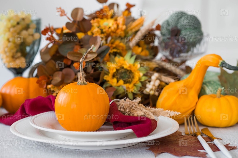 Красивая осенняя сервировка стола. Тарелка с хлопчатобумажной салфеткой и тыквой. Столовое золото и ваза с осенними цветами на льняной скатерти. Концепция праздничной сервировки на День Благодарения