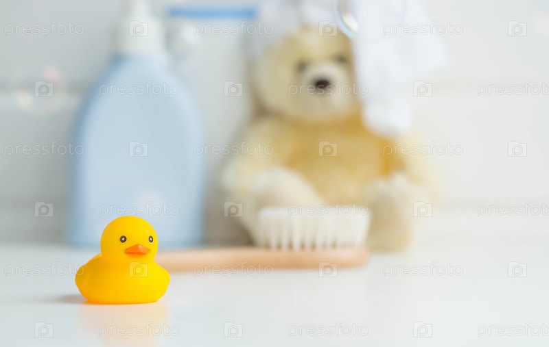 Детские банные принадлежности. Уход за детьми. Миниатюрный желтый резиновый утенок для купания с щеткой и бутылками с шампунем. Мыльные пузыри, пена для ванн