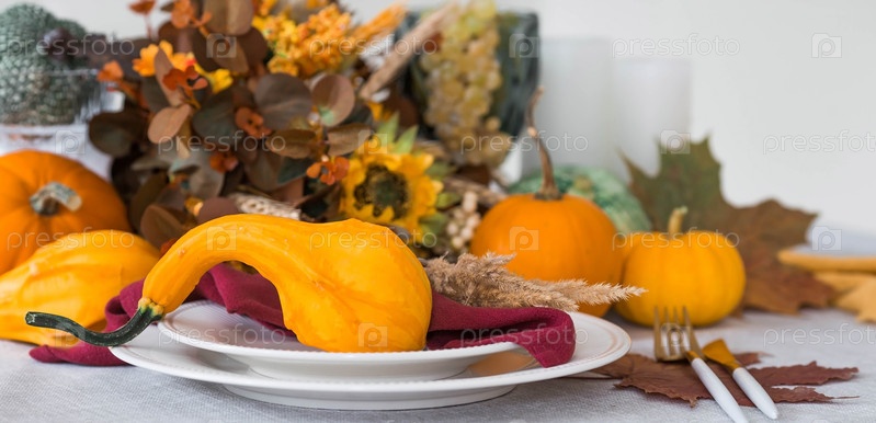 Красивая осенняя сервировка стола. Тарелка с хлопчатобумажной салфеткой и тыквой. Столовое золото и ваза с осенними цветами на льняной скатерти. Концепция праздничной сервировки на День Благодарения