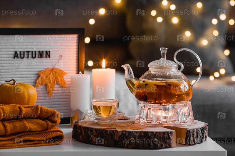 Натюрморт. Одеяло, тыквы, чайник и чашка чая на журнальном столике в домашнем интерьере гостиной. Уютная осенняя концепция