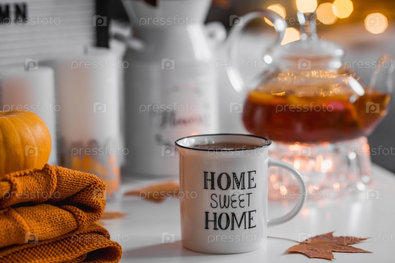 Уютная осенняя концепция. Домашнее тепло в холодную погоду. Натюрморт. Одеяло, тыквы, цветы и чашка чая на журнальном столике в интерьере дома гостиной