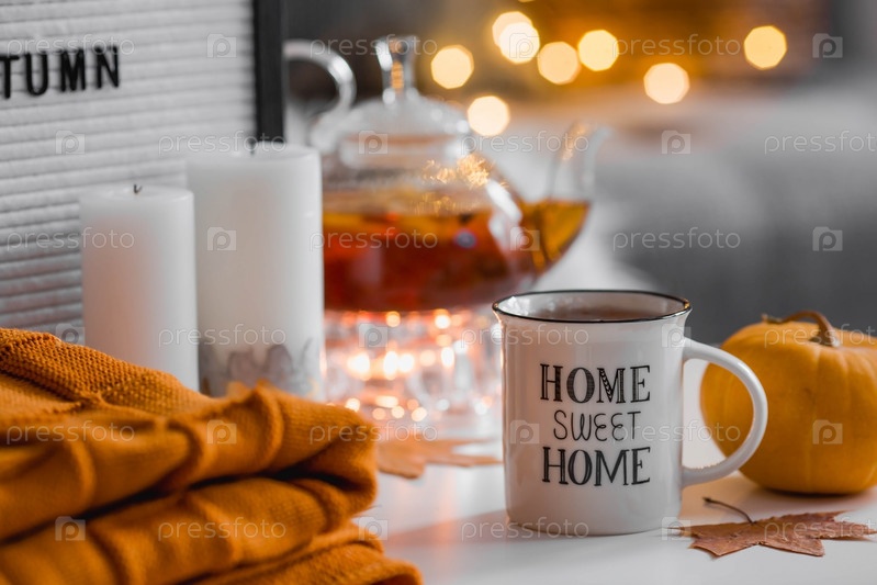 Уютная осенняя концепция. Домашнее тепло в холодную погоду. Натюрморт. Одеяло, тыквы, цветы и чашка чая на журнальном столике в интерьере дома гостиной
