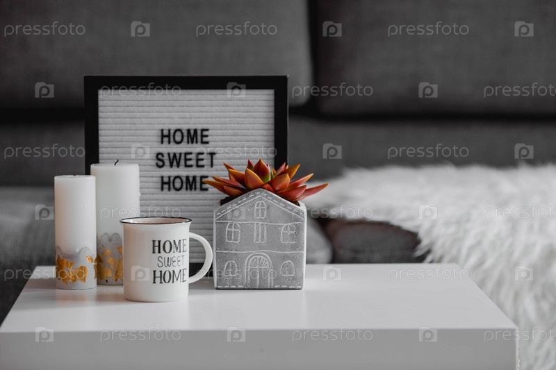 Уютная осенняя концепция. Домашнее тепло в холодную погоду. Натюрморт. Одеяло, тыквы, цветы и чашка чая на журнальном столике в интерьере дома гостиной