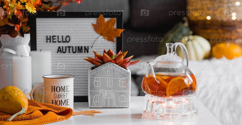 Натюрморт. Одеяло, тыквы, чайник и чашка чая на журнальном столике в домашнем интерьере гостиной. Уютная осенняя концепция