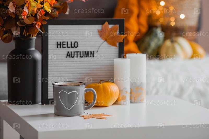 Уютная осенняя концепция. Домашнее тепло в холодную погоду. Натюрморт. Одеяло, тыквы, цветы и чашка чая на журнальном столике в интерьере дома гостиной