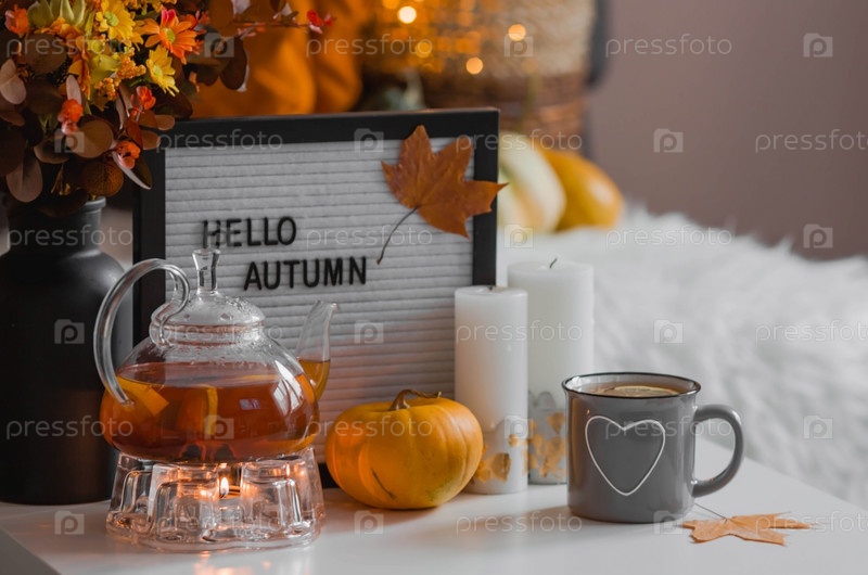 Натюрморт. Одеяло, тыквы, чайник и чашка чая на журнальном столике в домашнем интерьере гостиной. Уютная осенняя концепция