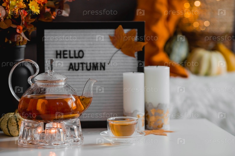 Натюрморт. Одеяло, тыквы, чайник и чашка чая на журнальном столике в домашнем интерьере гостиной. Уютная осенняя концепция