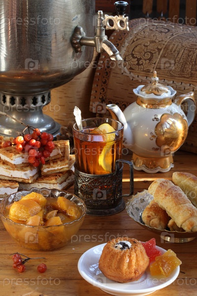 Натюрморт с ароматным чаем, большим самоваром и печеньем