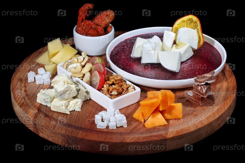 Ассорти сыров на тарелке с виноградом, вялеными помидорами, соусом на черном фоне