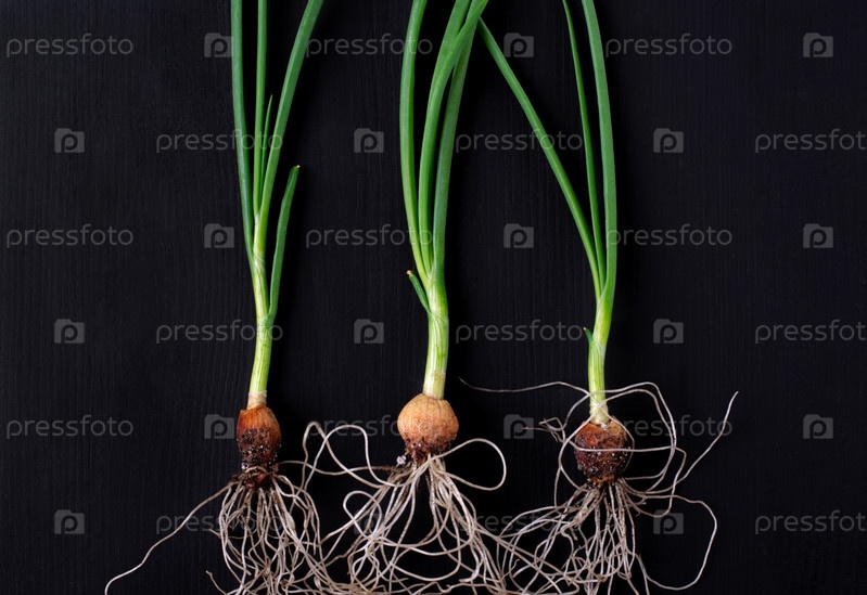 Маленькие луковицы зеленого лука с корнями на черном. Выращивание трав в домашних условиях