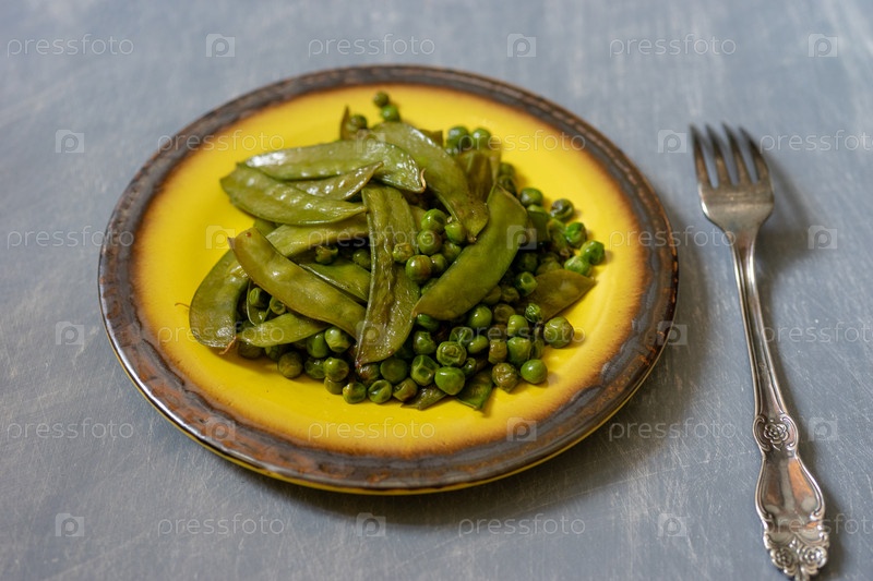 Жареный зеленый горошек на керамической желтой тарелке